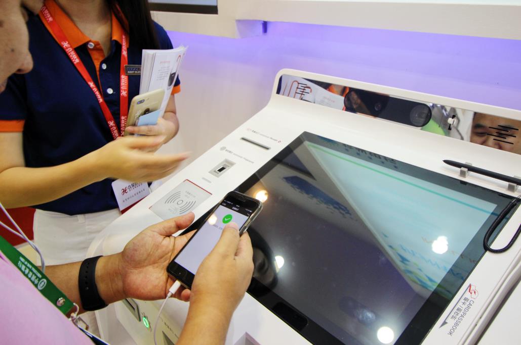 展示區另外一個人氣爆款就是位于智慧銀行區域的“微信存取款”智慧柜員機,這是證通研發制造的國內首款具有手機微信賬戶實時提現、存款的智慧柜員機,用戶可通過機器提取自己微信賬戶中的零錢。