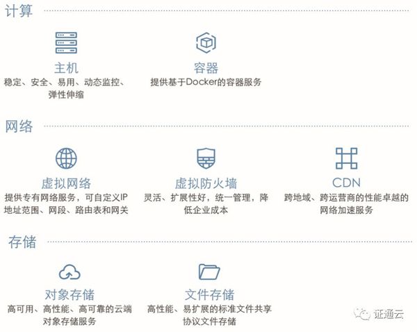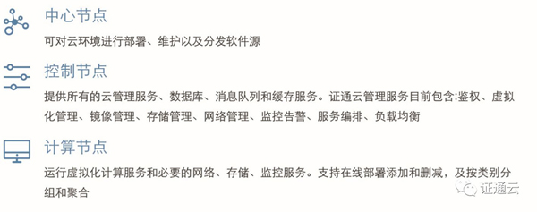在功能組件上劃分為證通云棧、證通云臺、證通云池、證通云數、證通云固、證通云監、證通云管七大部分。